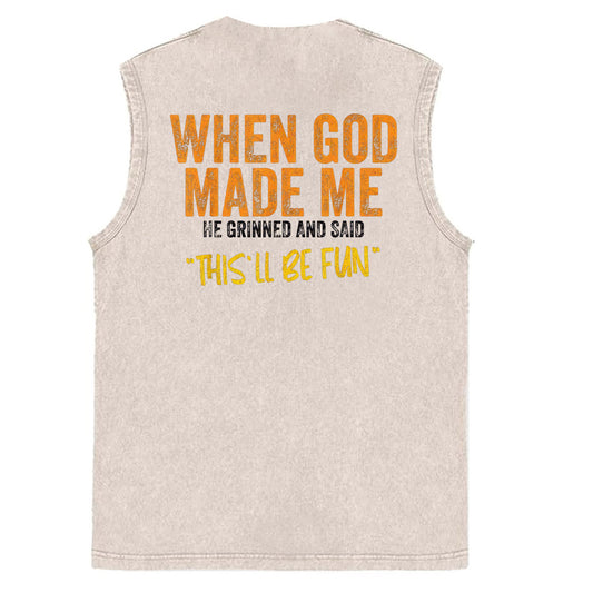When God Made Me He Grinned And Said This'll Be Fun Pattern Sleeveless Cotton Washed Printed Loose Vest