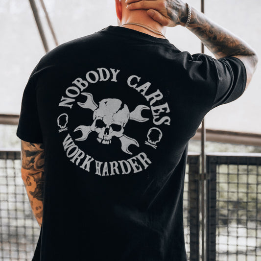 NOBODY CARES, WORK HARDER Skulls with Handles Black Print T-shirt