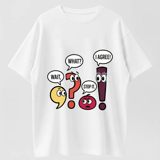 Cartoon Punctuation Characters What? Wait, Stop It, I Agree! T-Shirt - 100% Cotton Heavyweight