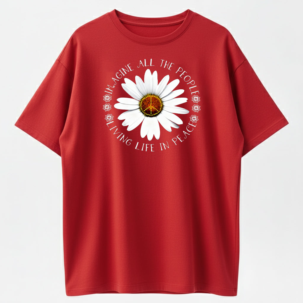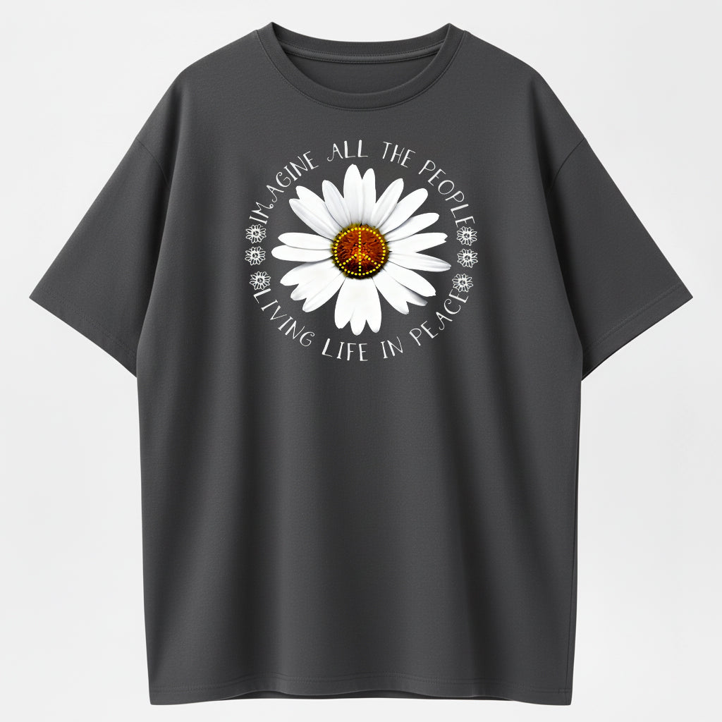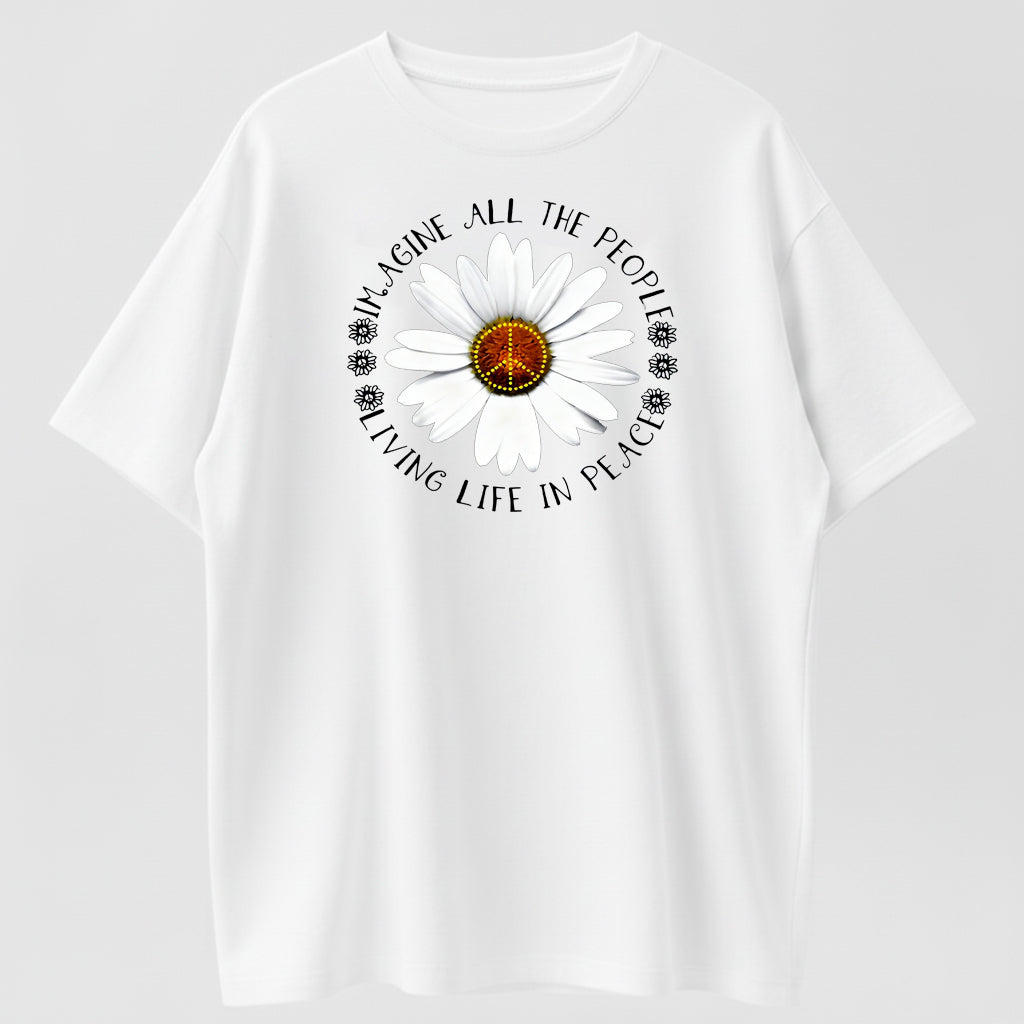 Imagine All The People Living Life In Peace Daisy Peace Sign T-Shirt - 100% Cotton