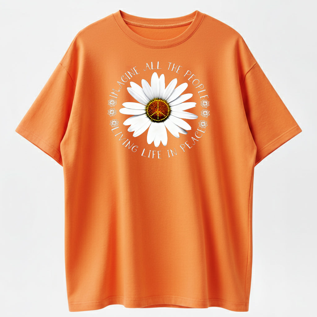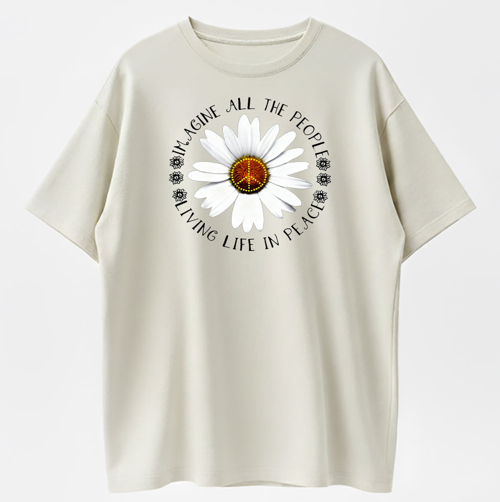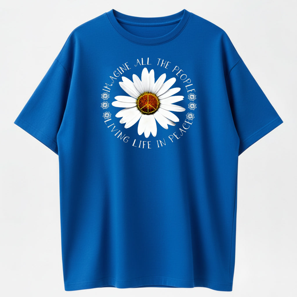 Imagine All The People Living Life In Peace Daisy Peace Sign T-Shirt - 100% Cotton