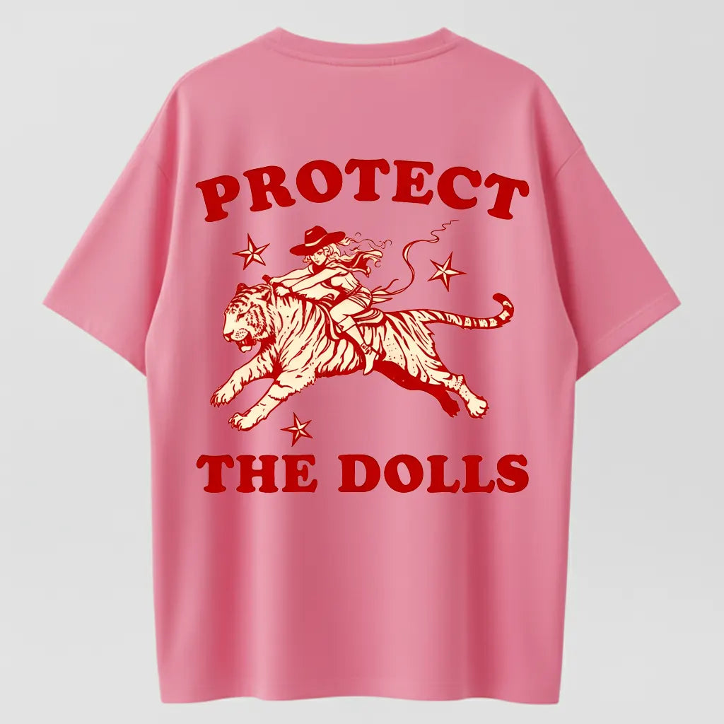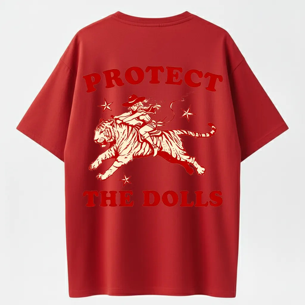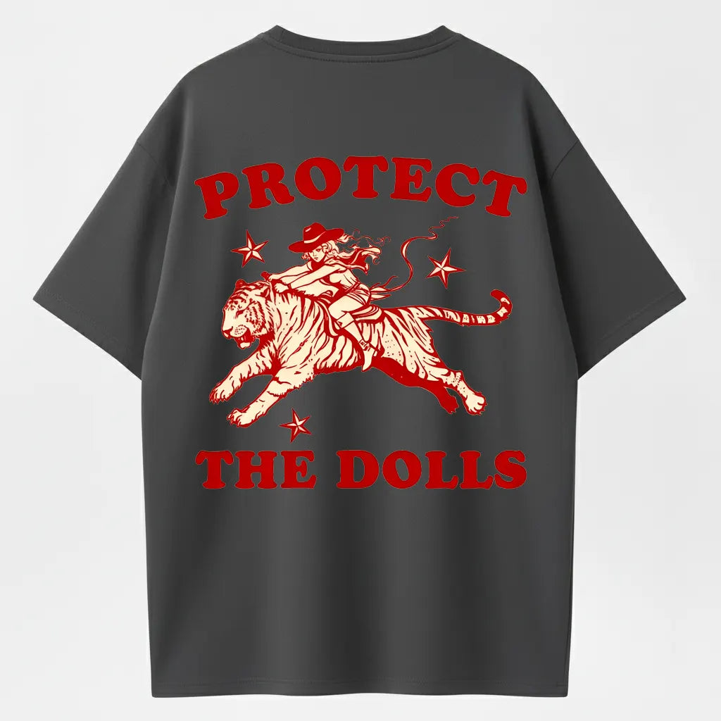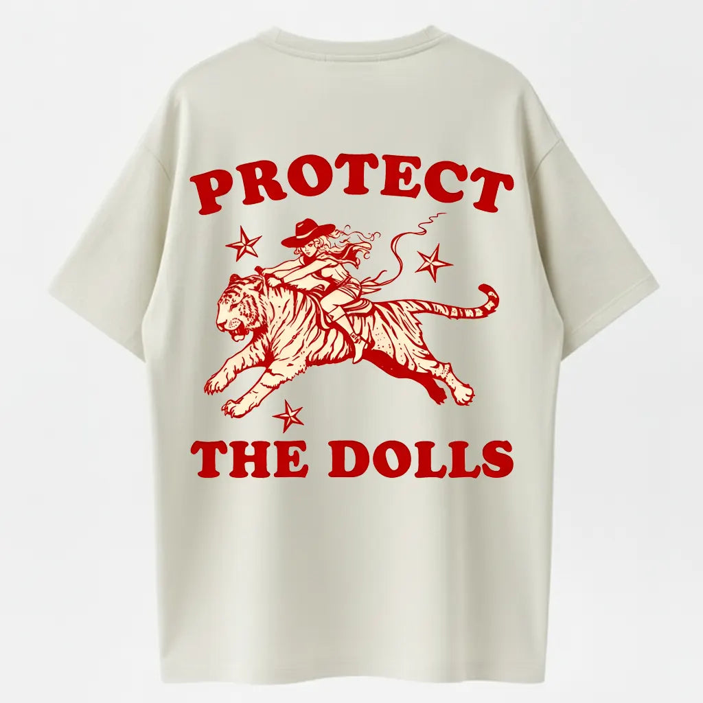 "Protect The Dolls" Vintage Cowgirl & Tiger Graphic T-Shirt - 100% Cotton Heavyweight(Reverse Design)