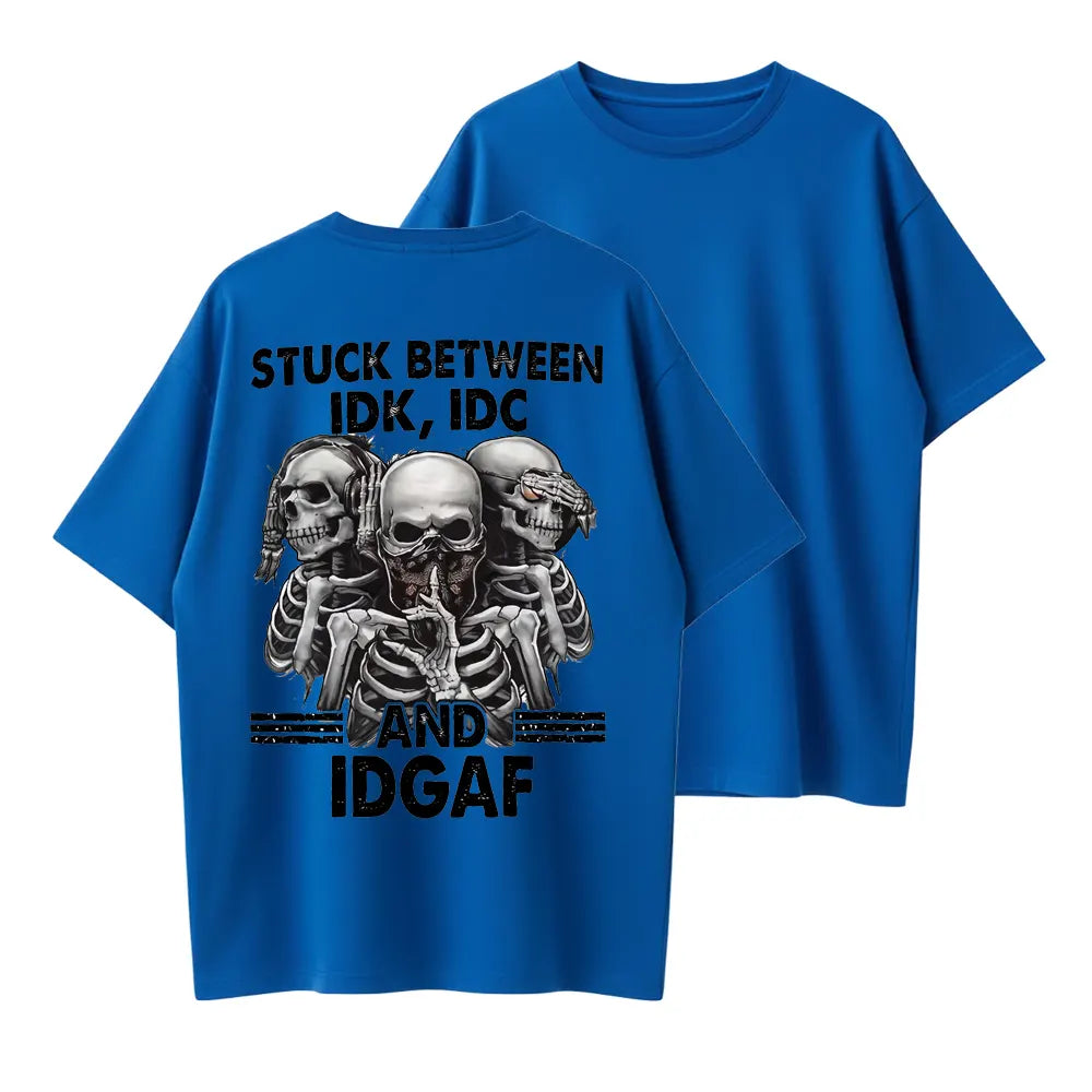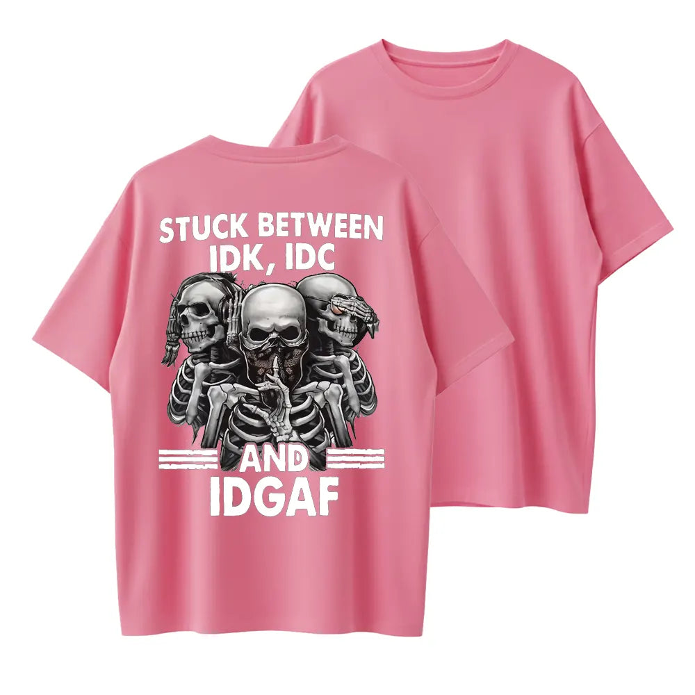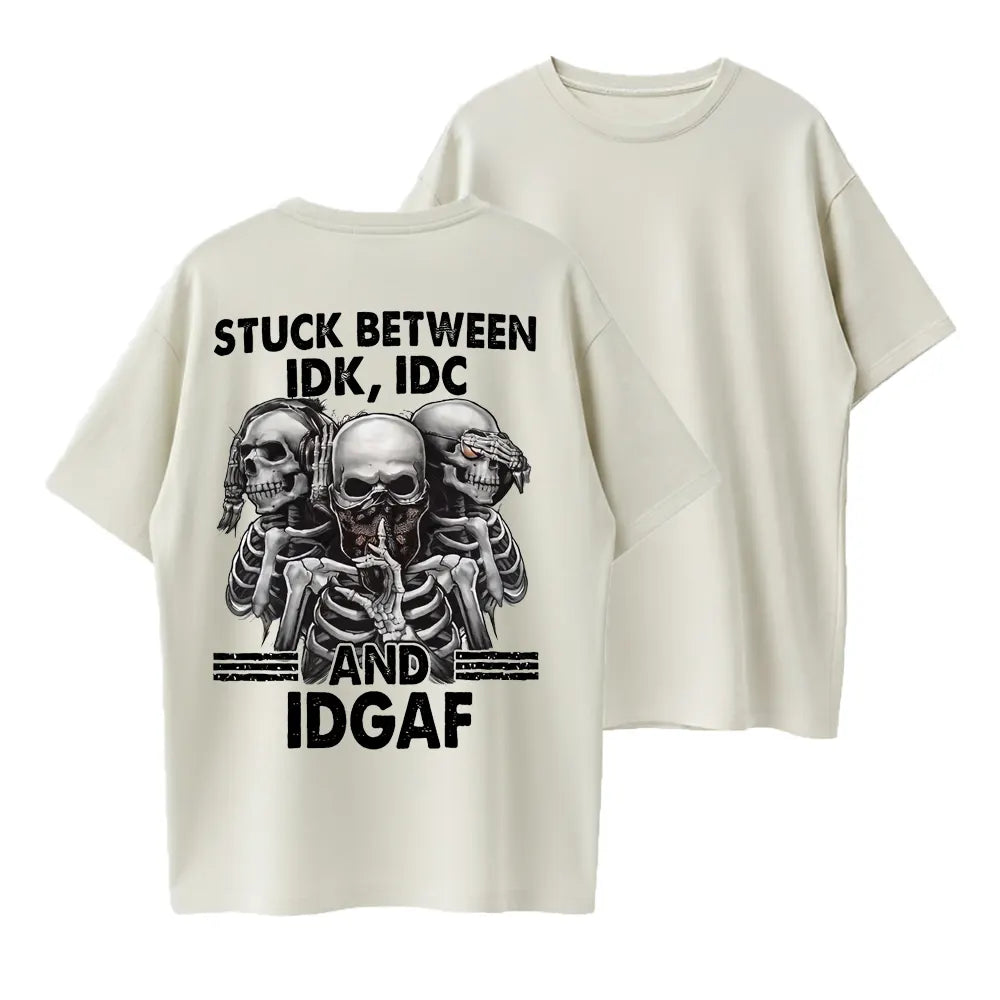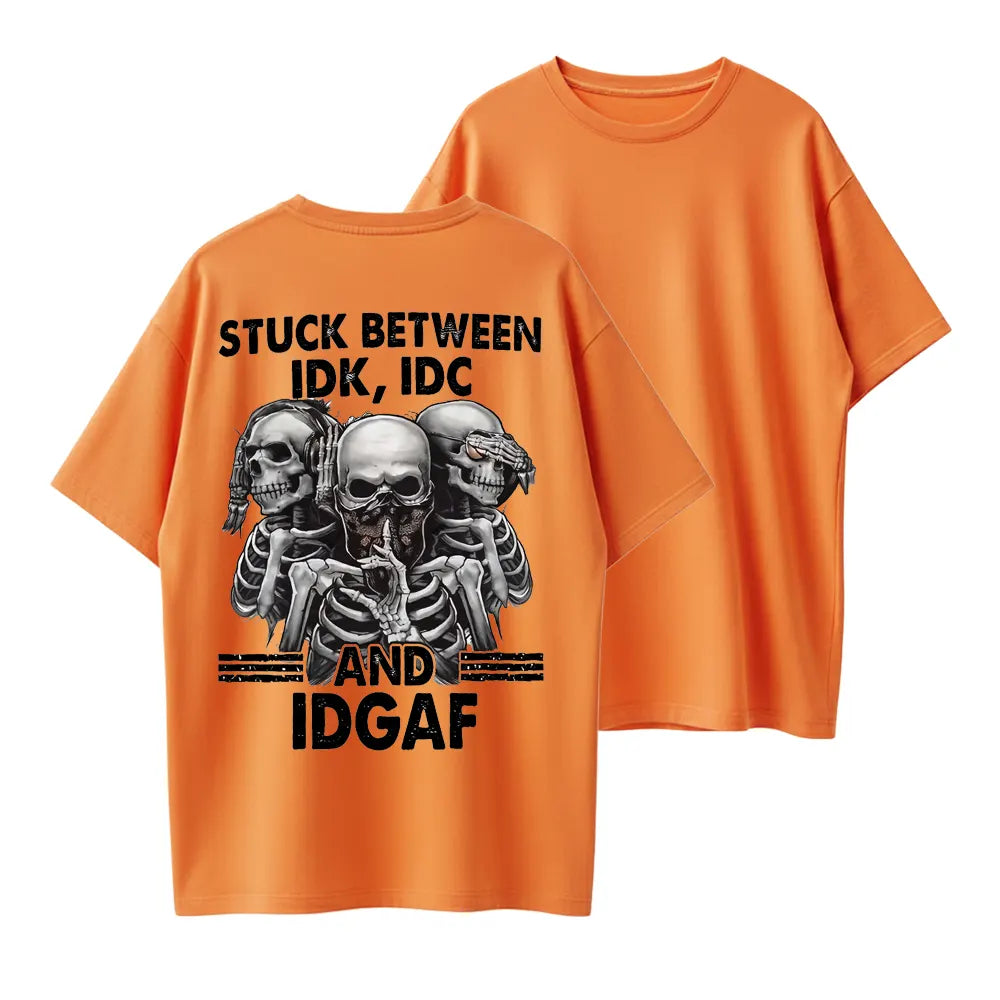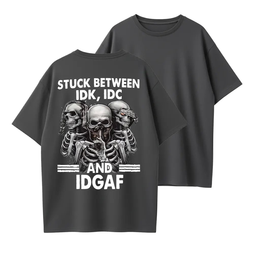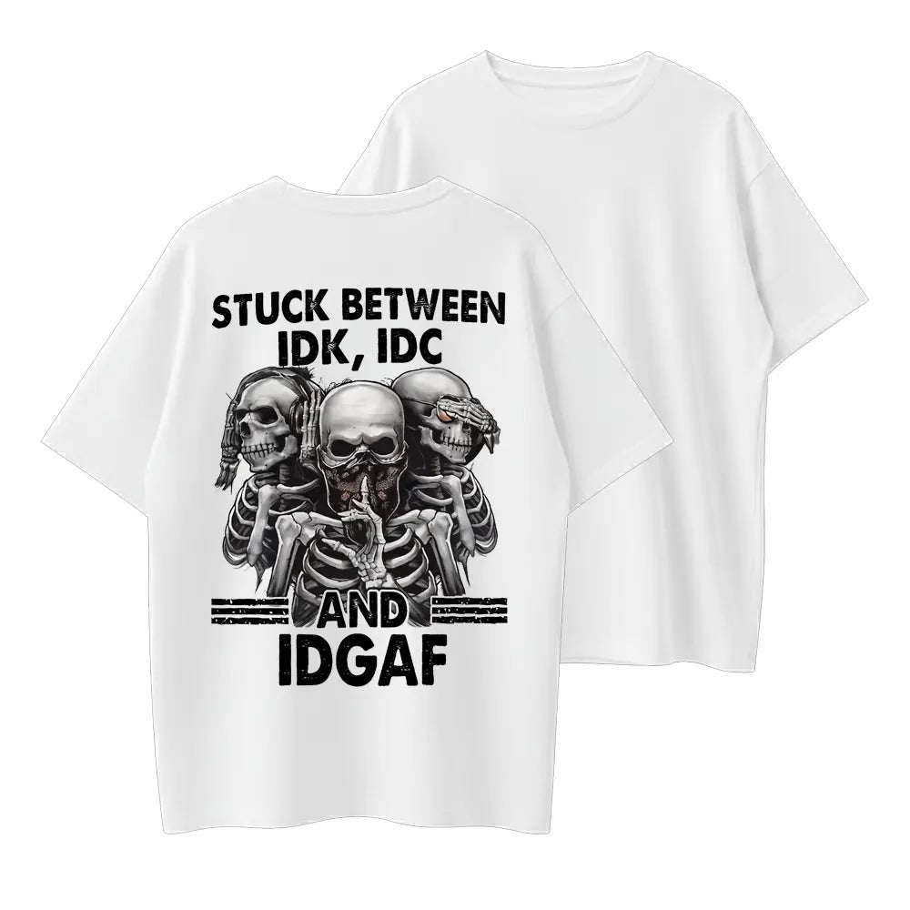 Stuck Between IDK IDC IDGAF Funny Skull Graphic Organic Cotton Unisex T-Shirt
